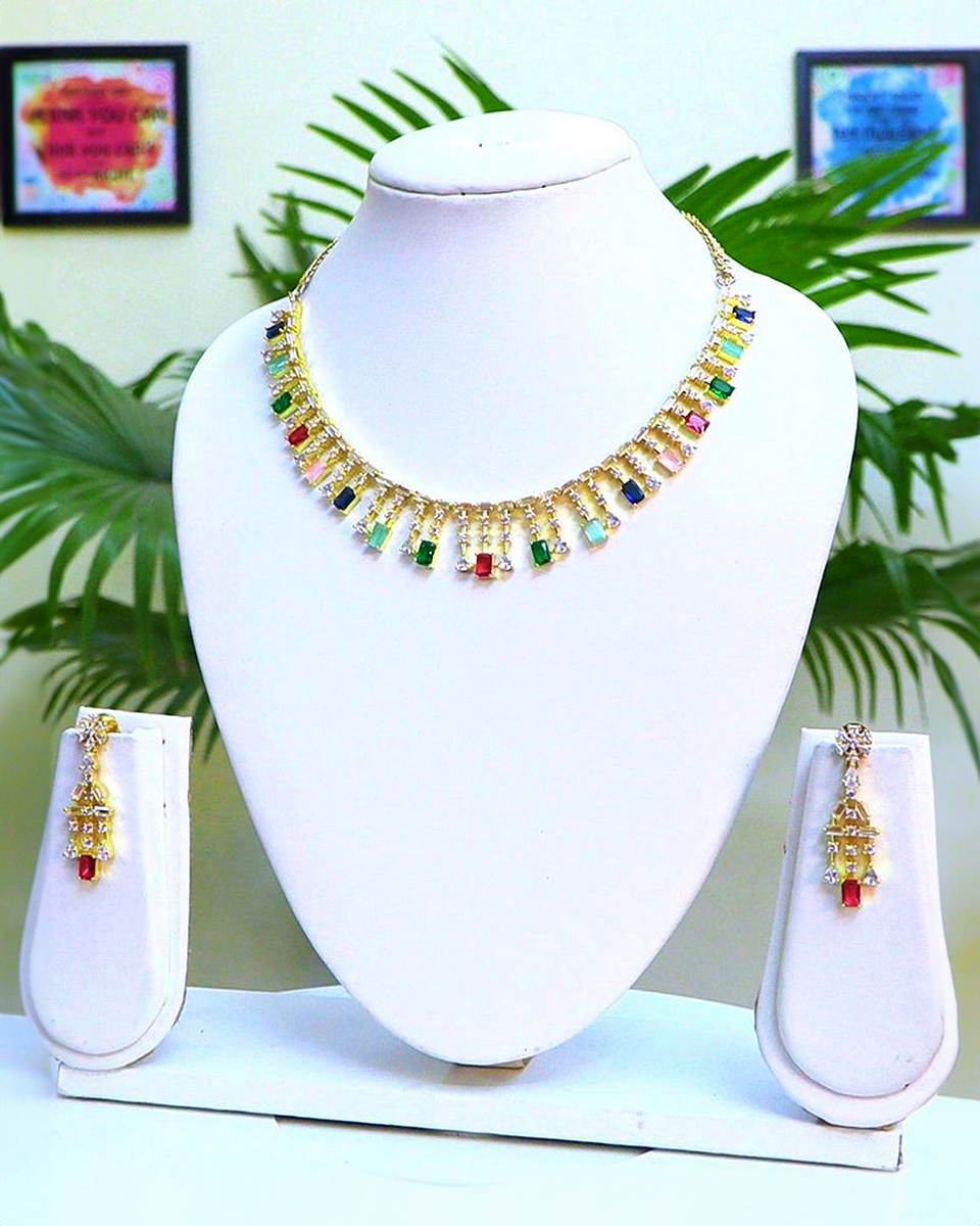 Brighten up your look with our Multi-Color Gemstone Necklace Set, featuring a vibrant array of colored gemstones, meticulously arranged to create a dazzling, eye-catching statement. The golden finish enhances the beauty of the sparkling stones, making this set perfect for any festive or special occasion.