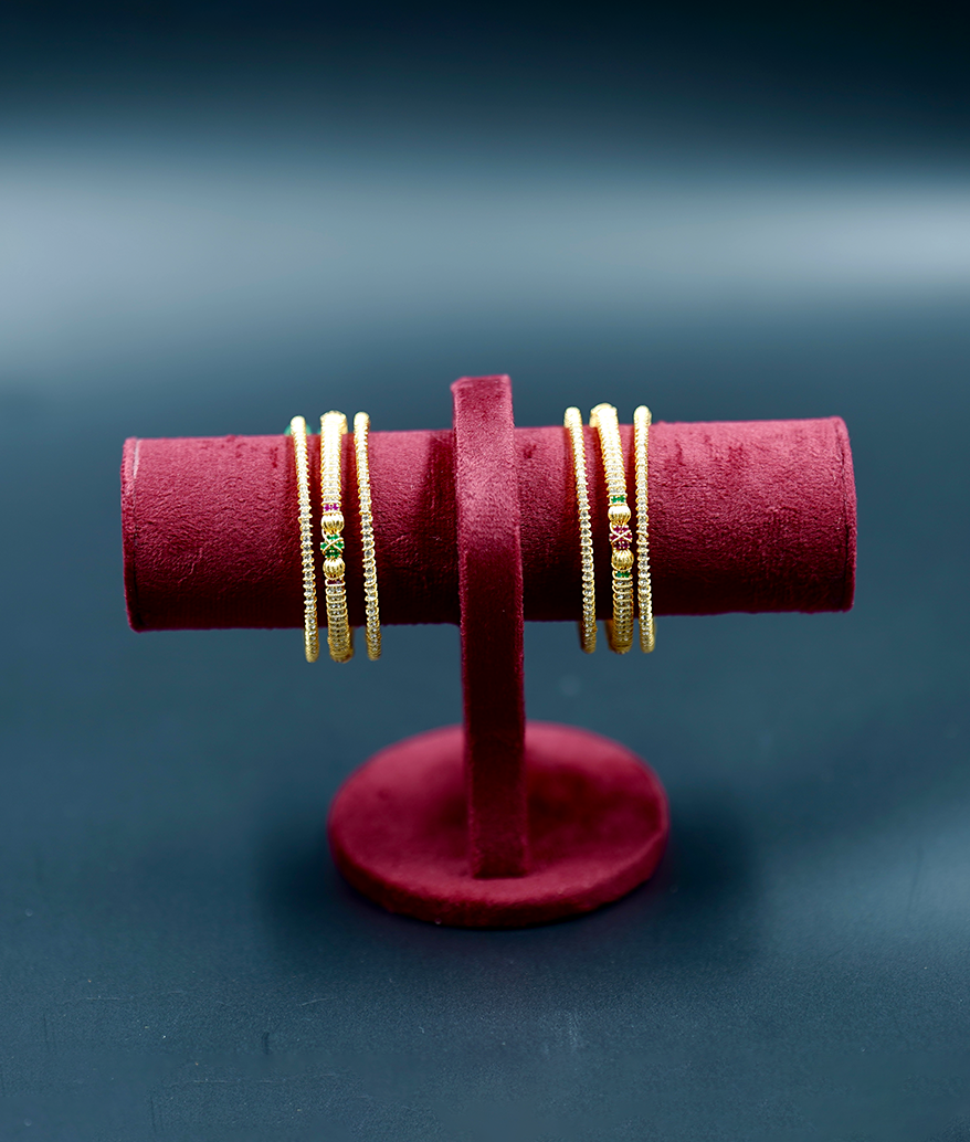 This Gold Beaded Bangles Set brings together timeless beauty and delicate craftsmanship. The set features sleek golden bangles interspersed with shimmering beads, offering a perfect balance of elegance and simplicity. The versatile design makes it suitable for daily wear, festive occasions, or casual gatherings, adding a touch of sophistication to any outfit.