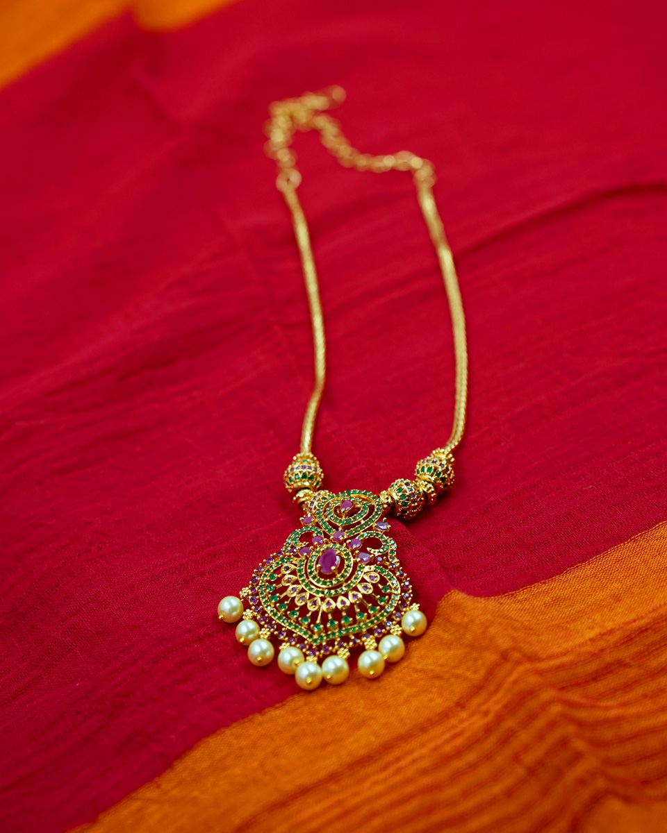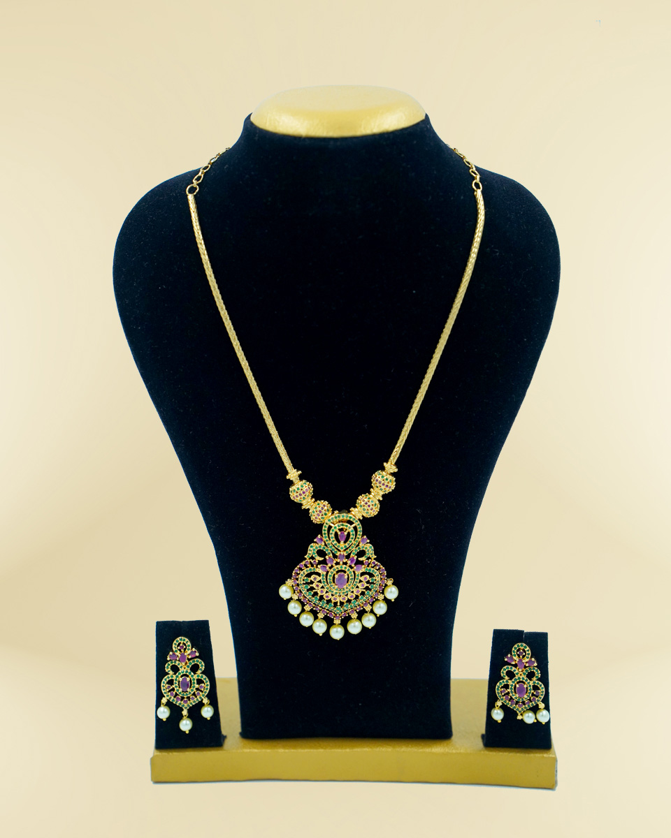 This Multi-Colour Haram Necklace Set is an exquisite representation of tradition and elegance. The necklace features intricate gold plating, adorned with a stunning array of multicoloured stones, including purple and green gems, and beautiful white pearl drops that give it a timeless appeal. The matching earrings mirror the vibrant design of the necklace, making it a perfect addition to any festive occasion or special celebration.