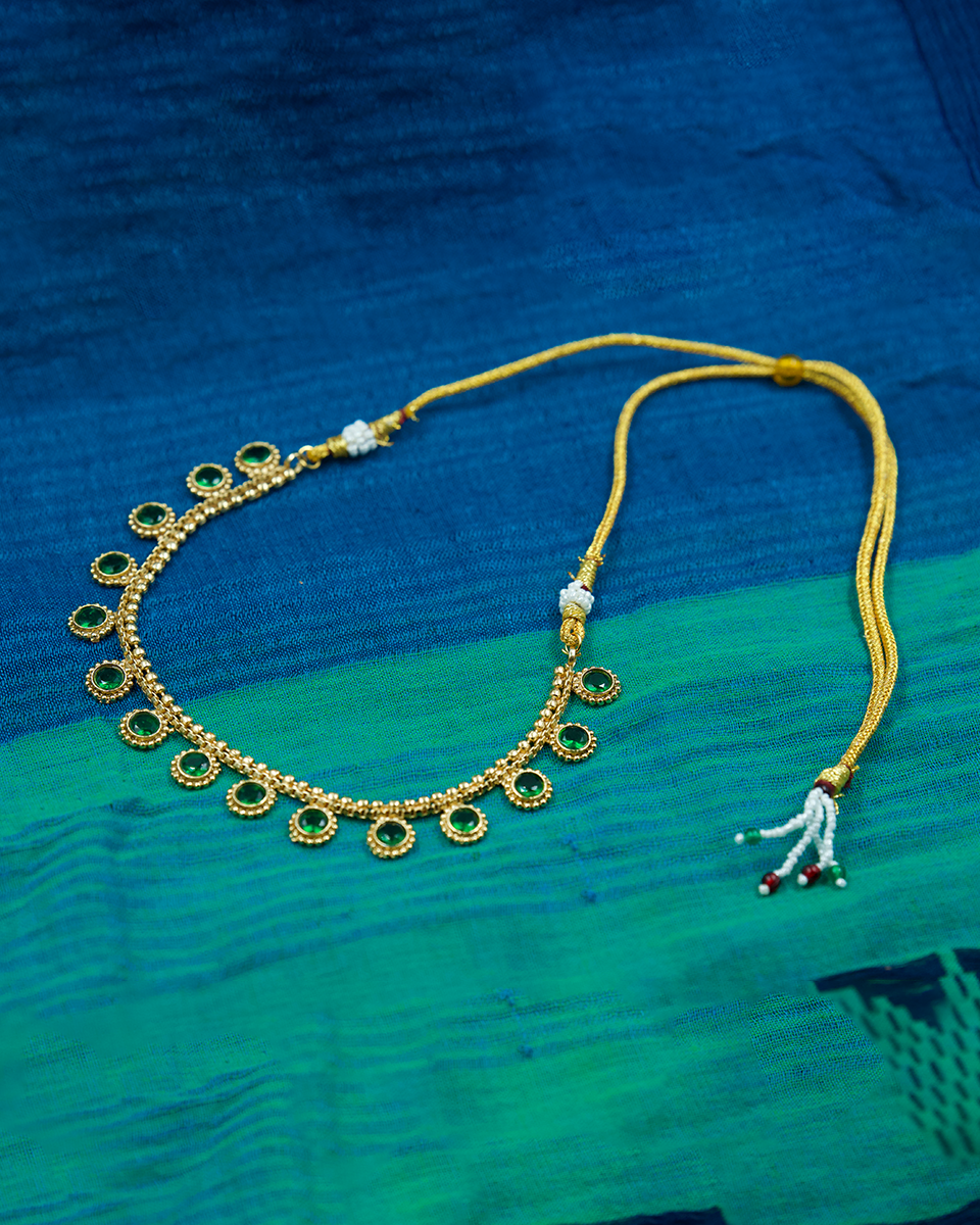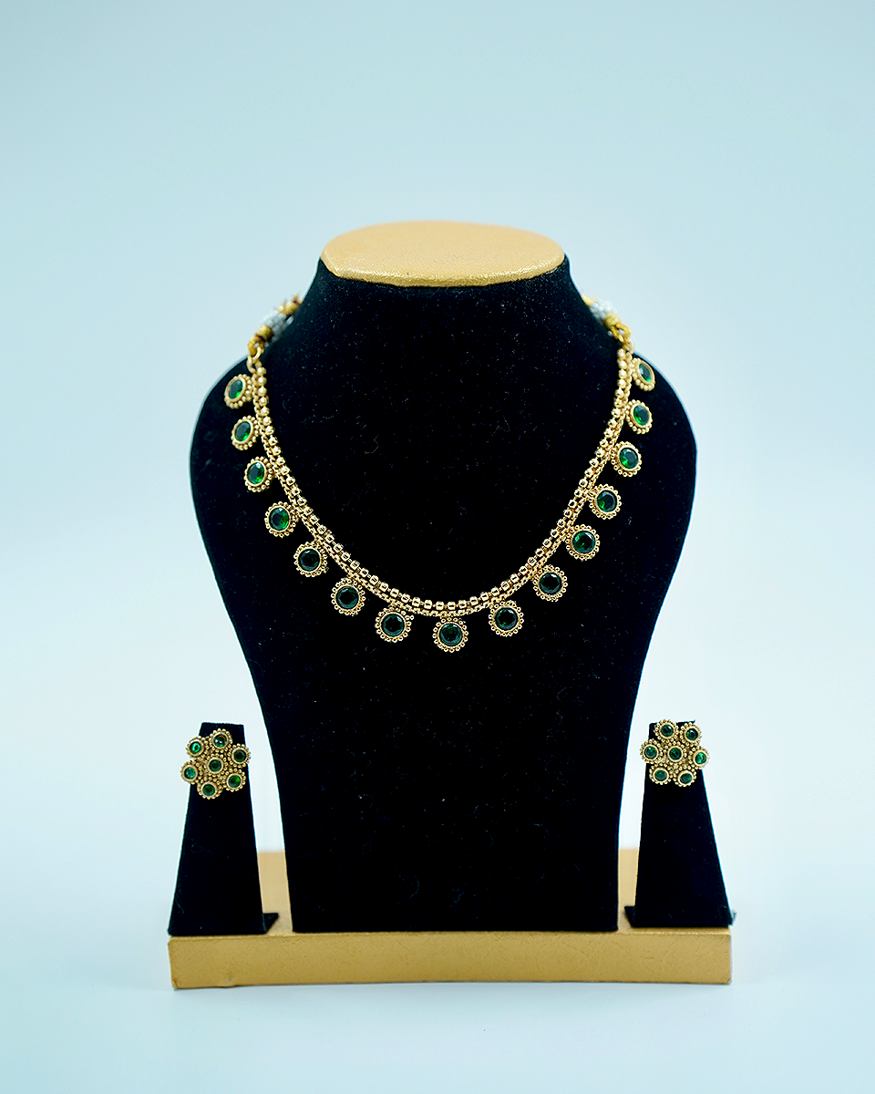 🔶 Design: Round stones in green set in a gold-plated chain with matching earrings