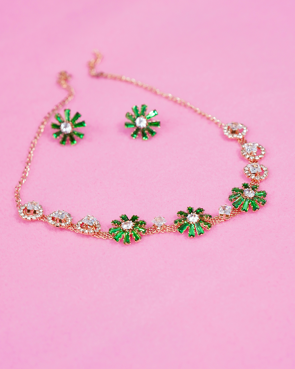 This elegant Green Flower Necklace features vibrant green petals with sparkling crystal centers, creating a striking and sophisticated look. The necklace is beautifully crafted with a gold-toned chain, while the matching earrings complete the set. Perfect for weddings, parties, and festive events, this set adds a pop of color and elegance to any outfit.