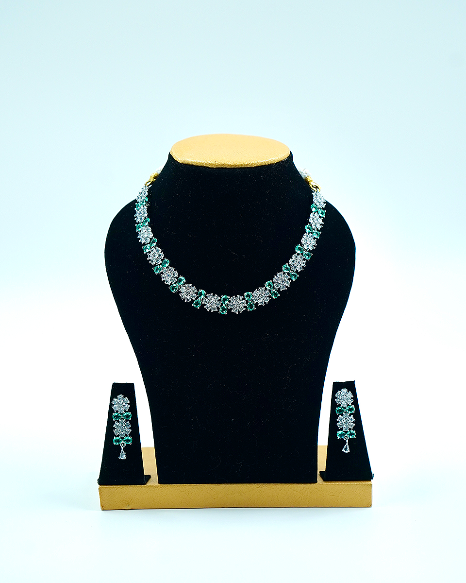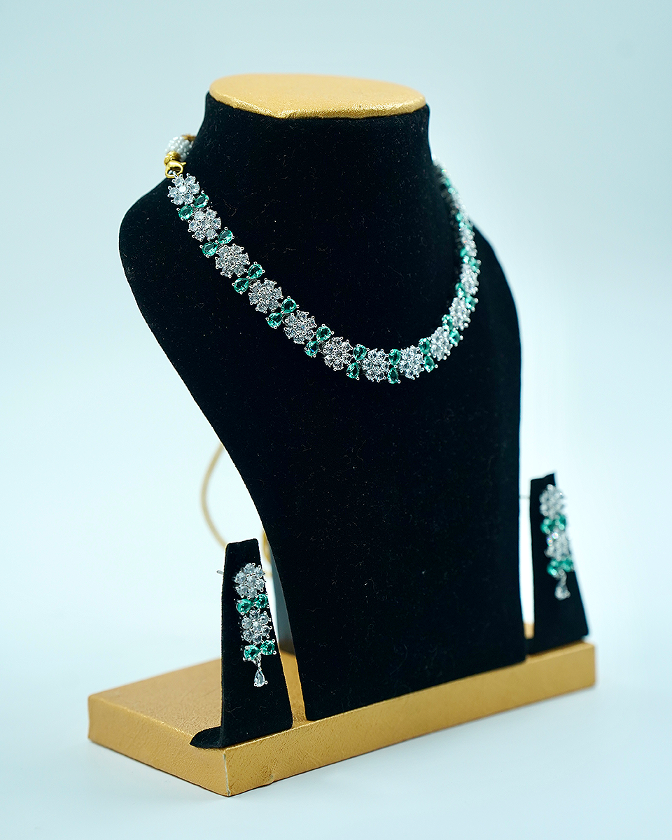 This exquisite Green and White Stone Necklace features a delicate arrangement of sparkling white stones interspersed with vibrant green accents, creating a perfect balance of elegance and charm. The intricate craftsmanship highlights the timeless appeal of this set, while the matching earrings mirror the design with an added touch of sophistication. Ideal for weddings, formal events, and festive occasions, this set adds a graceful sparkle to your outfit.
