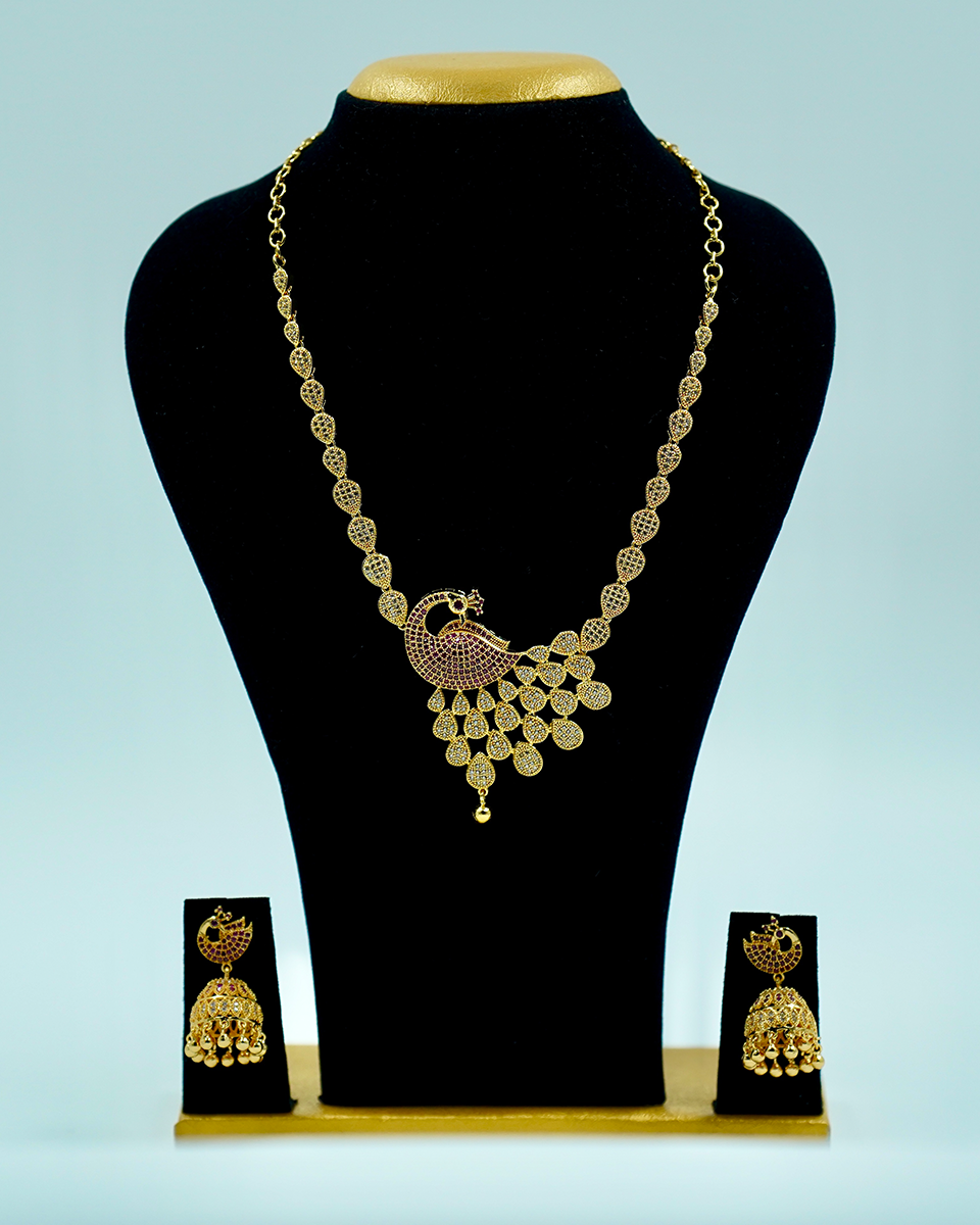 This gorgeous Peacock Necklace Set features a beautifully crafted peacock pendant decorated with red stones, symbolizing grace and elegance. The intricate design and delicate filigree work make it an ideal choice for weddings, festivals, and special occasions. The set comes with matching jhumka earrings, completing your traditional look with a touch of royalty.
