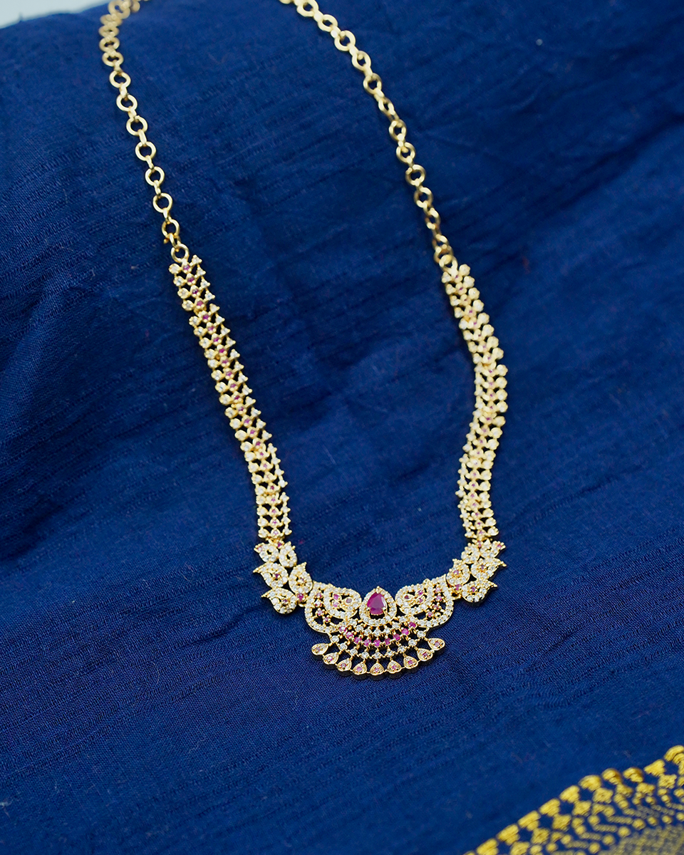 This exquisite Gold and Red Stone Necklace features stunning red stones set in intricate gold-toned designs, creating a rich and traditional look. The necklace is complemented by matching earrings, each featuring similar red stones and detailed gold work. Perfect for weddings, festive occasions, and formal events, this set adds a regal and elegant touch to any outfit.