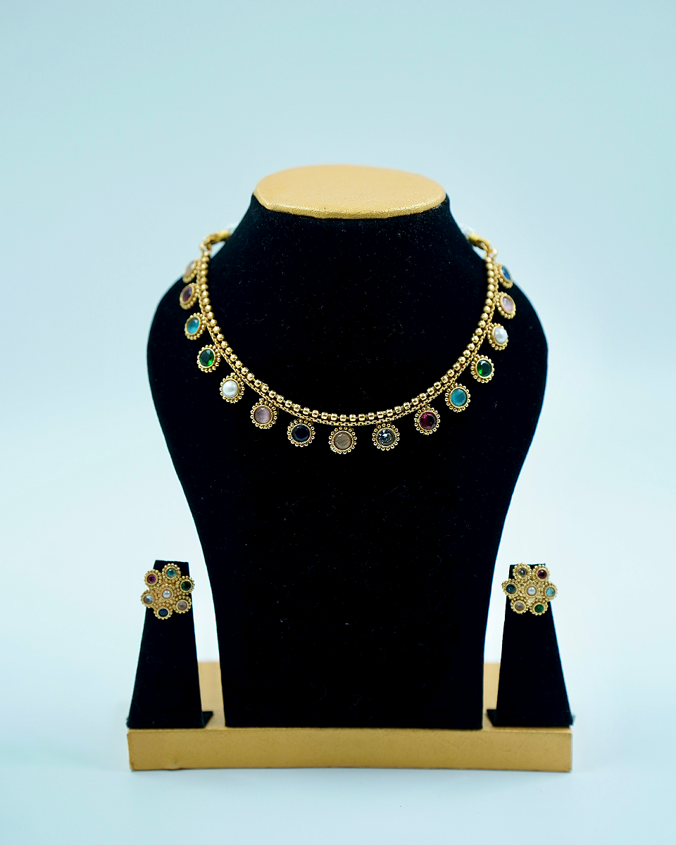 🔶 Design: Colourful round stones set in a gold-plated chain with matching earrings