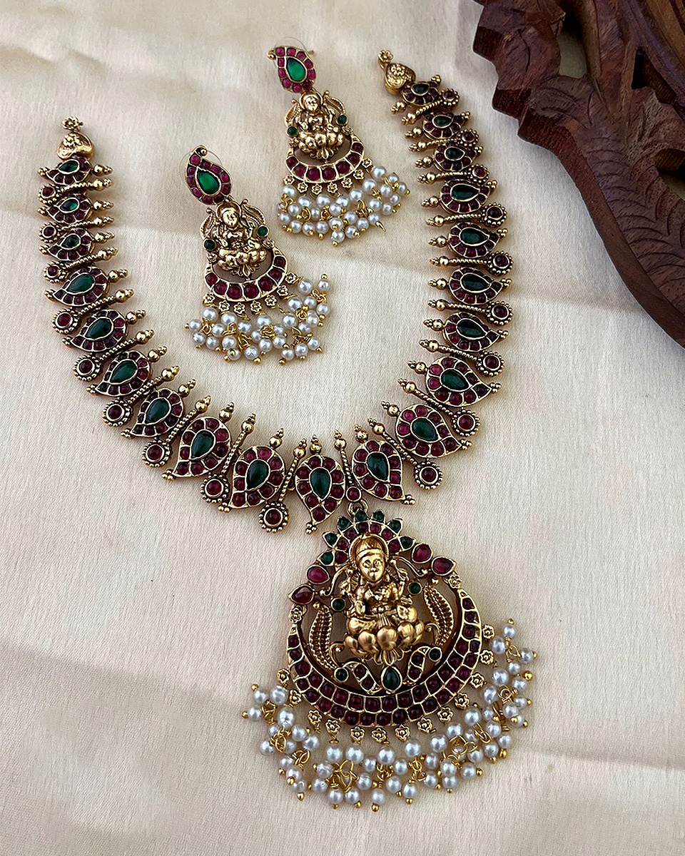 The Temple Lakshmi Emerald Ruby Gold necklace Set showcases timeless South Indian craftsmanship with paisley-shaped emerald stones, rich ruby accents, and antique gold detailing. Finished with a beautifully crafted Goddess Lakshmi pendant and delicate pearl hangings, this set is perfect for weddings, festive occasions, and traditional celebrations.