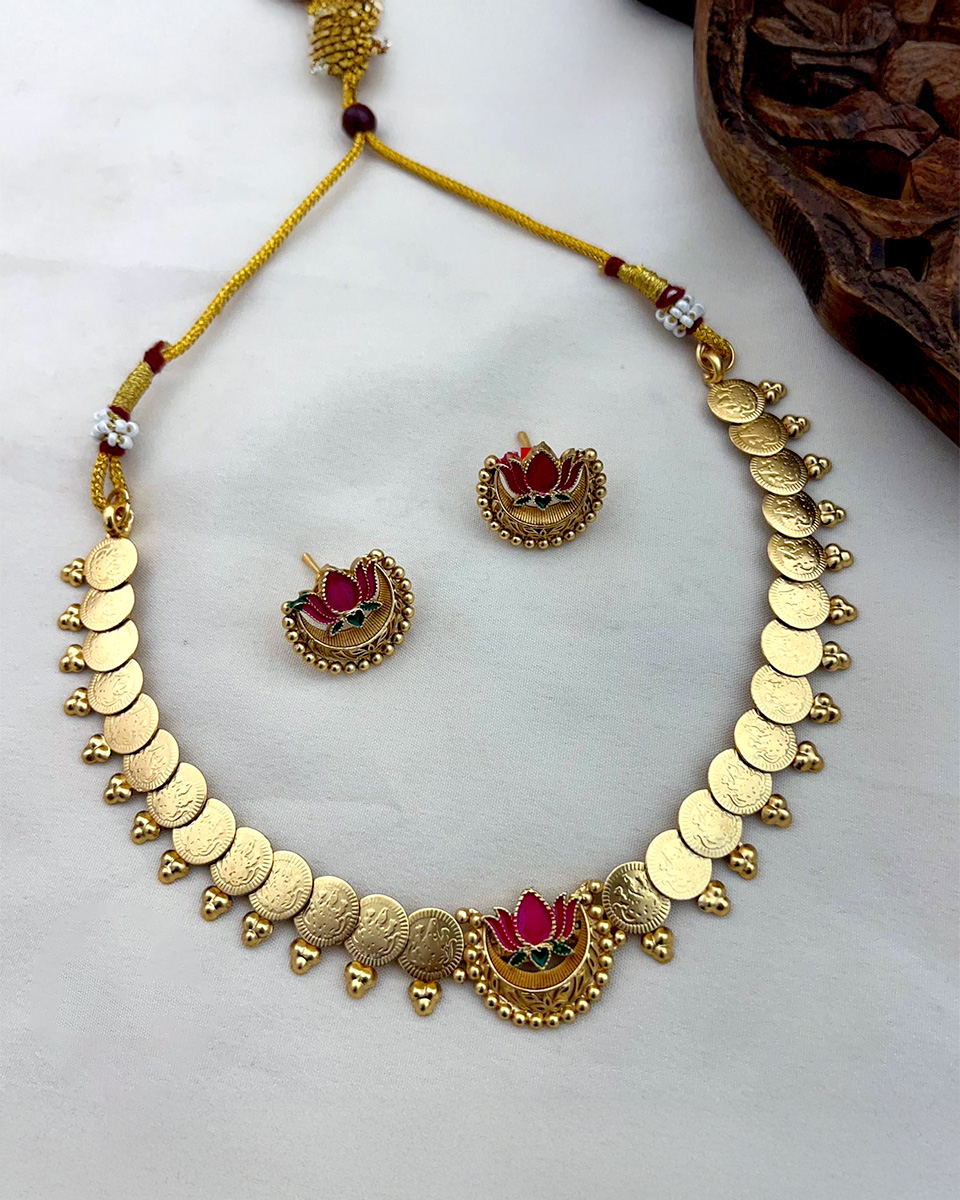 This necklace features a classic row of finely embossed Lakshmi coins, gracefully finished with soft gold bead drops that add gentle movement. The highlight is the lotus-inspired centerpiece accented in deep pink and green tones, giving the design a sacred yet elegant appeal. Paired with matching lotus stud earrings and a traditional thread closure, this set is perfect for temple visits, festive mornings, and traditional celebrations where simplicity meets heritage.