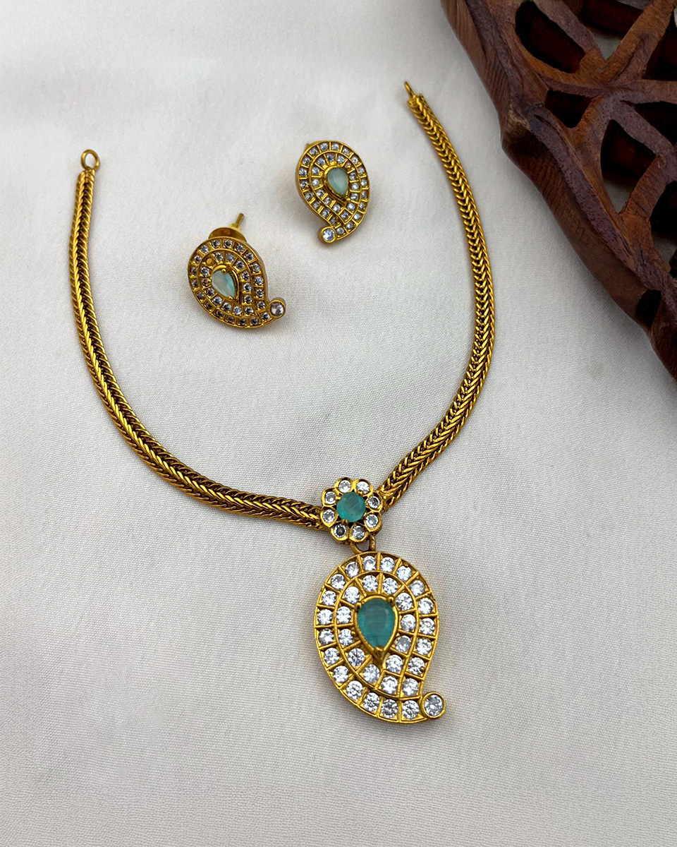 Designed around a graceful teardrop silhouette, this necklace features a luminous emerald-toned center framed by closely set crystal stones that create a striking illusion of depth and sparkle. The smooth, woven-style gold chain adds a contemporary touch, while the matching paisley-inspired earrings echo the pendant’s elegant curve. A refined choice for evening events, receptions, and modern ethnic styling where subtle brilliance makes the statement.