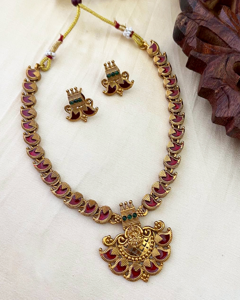 This traditional temple necklace features a continuous row of flame-shaped petal motifs highlighted with deep maroon enamel, creating a strong and distinctive neckline pattern. At the center, an intricately detailed Goddess Lakshmi motif is framed by ornate gold work and subtle green accents, adding depth and devotion to the design. Paired with matching temple earrings and finished with a classic thread closure, this set is ideal for weddings, poojas, and heritage occasions rooted in tradition.