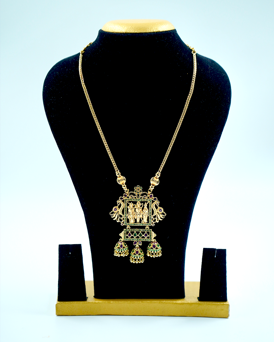 This beautiful Temple Jewelry Necklace features a detailed Sri Rama Pendant with fine filigree work. Decorated with green and red stones, it shows Lord Rama, Sita, and Lakshmana, symbolizing love and devotion. The hanging jhumkas add charm, making it perfect for weddings, festivals, and special occasions. A timeless piece for those who love traditional jewellery.