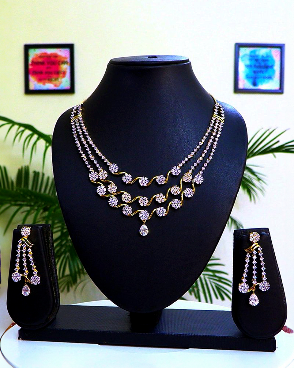 Turn heads with this exquisite Triple-Layer Floral Necklace Set, crafted with brilliance and elegance. Featuring sparkling floral motifs with teardrop danglers, the necklace layers beautifully to create a statement look. Comes with matching long-drop earrings for a complete ensemble that’s perfect for weddings and festive occasions.